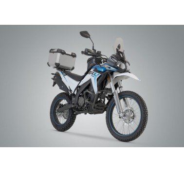 El sistema topcase TRAX ADV está compuesto por el robusto topcase plateado y el correspondiente portaequipaje ADVENTURE-RACK para la Voge 300 Rally.