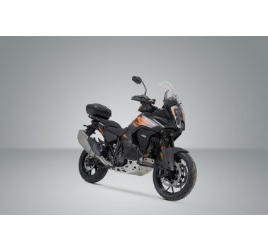 Una topcase deportiva y ligera para la KTM 1290 Super Adventure: con el juego compuesto por la topcase URBAN ABS y el ADVENTURE-RACK, SW-MOTECH ofrece una solución elegante a la vez que robusta para viajar con poco equipaje.El juego incluye el portaequipaje ADVENTURE-RACK; que convence por su extremada resistencia y su diseño funcional. Más de 15 años de experiencia en la fabricación de portaequipajes y las opiniones de los clientes y los conductores de prueba han dado lugar a la creación de este portaequipajes de aluminio. El grosor del material, el peso y la geometría han sido optimizados para trayectos exigentes así como para su aplicación fuera de la carretera. En la entrega va incluido Kit de adaptadores para el portaequipaje ADVENTURE-RACK para fijar el topcase URBAN ABS.