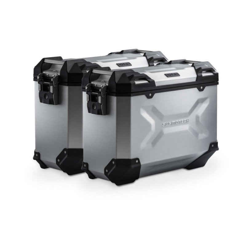 Las resistentes maletas de aluminio TRAX ADV son ideales para cualquier tipo de trayecto: las impresiones del diseño contribuyen a la estabilidad del material de la estructura de aluminio soldado de 1,5 mm de espesor. La tapa completamente extraíble con asas de transporte de aluminio anodizado y cierre rápido facilitan la colocación y retirada de la maleta de motocicleta, y los bordes laterales biselados crean una elevada separación con el suelo para los trayectos con curvas. Esta completa solución ofrece todos los componentes necesarios para poder embarcarse en viajes largos con las TRAX: dos maletas laterales TRAX ADV impermeables, dos soportes laterales de SW-MOTECH extraíbles, kit de adaptadores, juego de candados, limitador de apertura y sistema antirrobo a un precio muy atractivo.