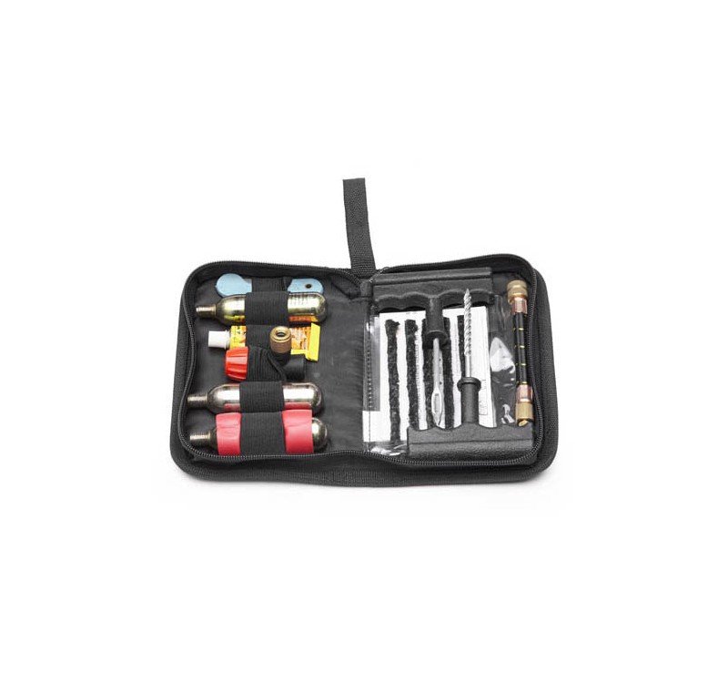 En el interior del práctico estuche se encuentra todo lo necesario para reparar el pinchazo del neumático. Para motos sin cámara