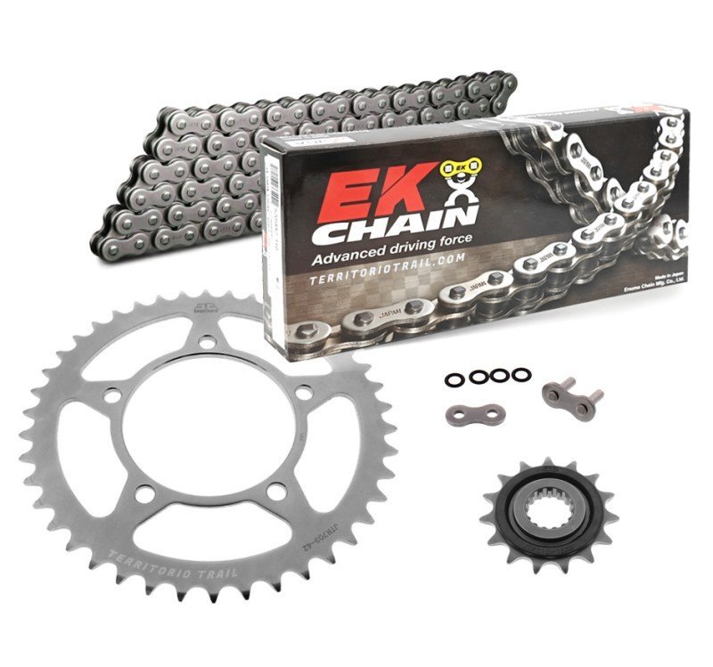 Los tres elementos están fabricados con altos estándares de calidad y niveles de resistencia. La cadena EK Chain ha sido desarrollada para manejar la potencia del motor de su motocicleta y se adapta a la dureza de los piñones y coronas JT