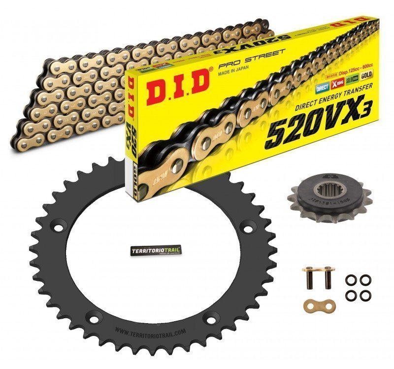 - Cadena: Cadena abierta DID X-RING 520 VX3 dorada (resistencia a la tracción 3720kg) de 116 eslabones, con enganche por remache. (disponible opcionalmente enganche por clip, vendido por separado ver accesorios)