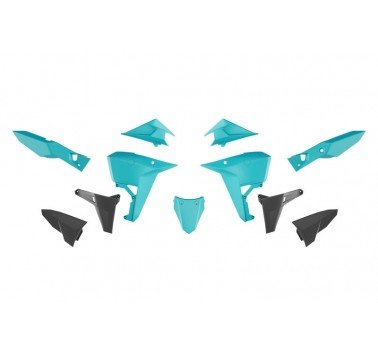 Kit de plástico fabricado en tecnopolímero, diseñado para maximizar la estética y resistir impactos. El kit transforma el estilo de la moto con un guardabarros trasero más largo, un panel trasero para la matrícula y entradas de aire del radiador de nuevo diseño.