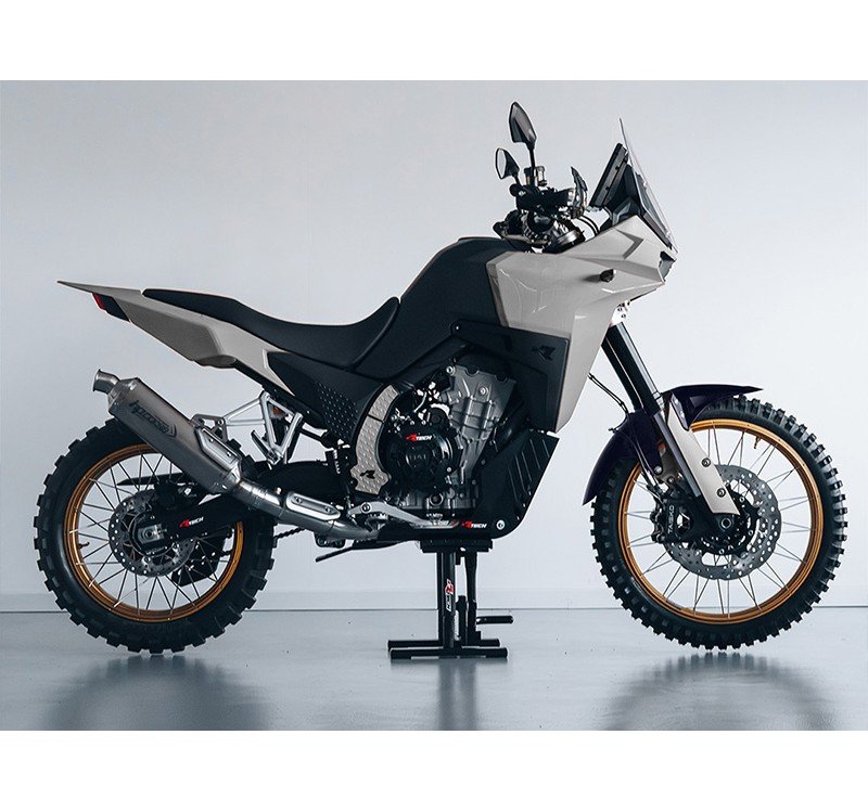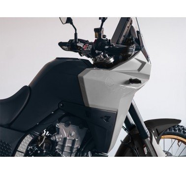 Kit de plástico fabricado en tecnopolímero, diseñado para maximizar la estética y resistir impactos. El kit transforma el estilo de la moto con un guardabarros trasero más largo, un panel trasero para la matrícula y entradas de aire del radiador de nuevo diseño.