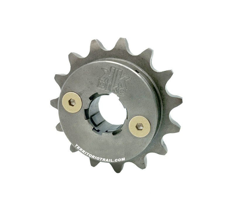 Las formas del piñón KKBike se han remodelado respecto a las originales, aumentando el ancho de la parte dentada y se ha cambiado el tipo de bloqueo, que ya no está en modo frontal sino lateral. Esto permite que se aloje la mayor superficie posible de zona dentada del piñón sobre el eje de transmisión secundario, con los siguientes beneficios: