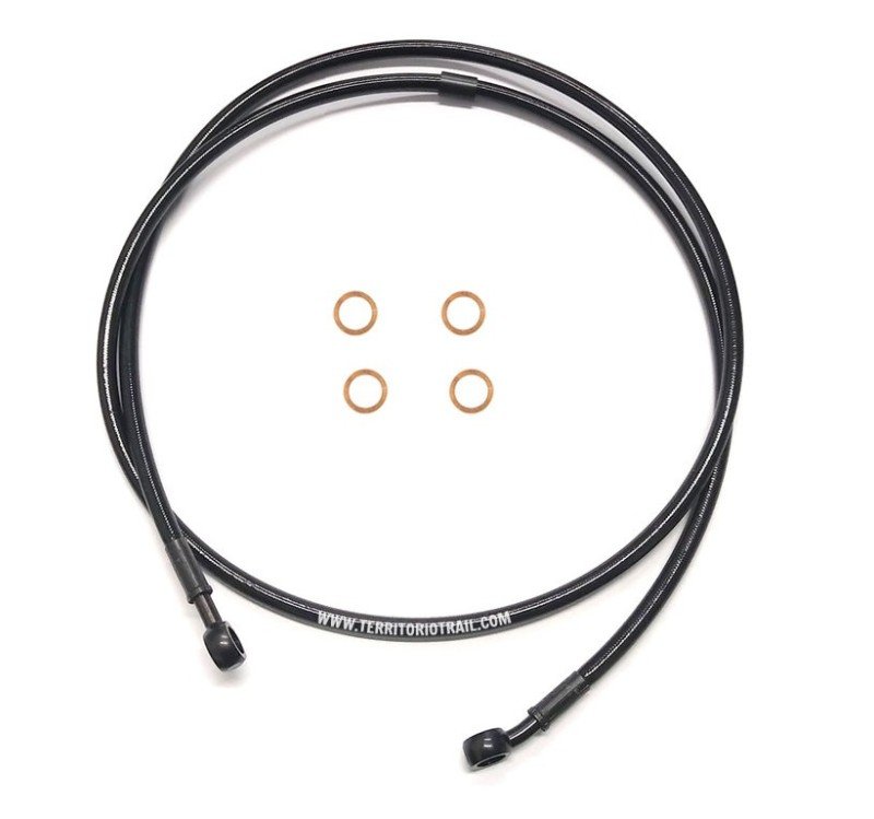 Latiguillos de freno JMP confeccionados con racores de acero y prensados con tuberia de teflón revestida con acero trenzado. De esta manera se elimina la sensación de freno esponjoso, que se tiene a partir de latiguillos convencionales de caucho. El acero inoxidable también ofrece una perfecta protección contra la oxidación.