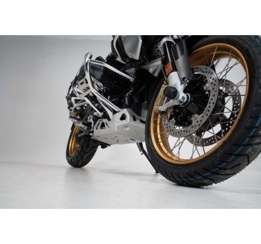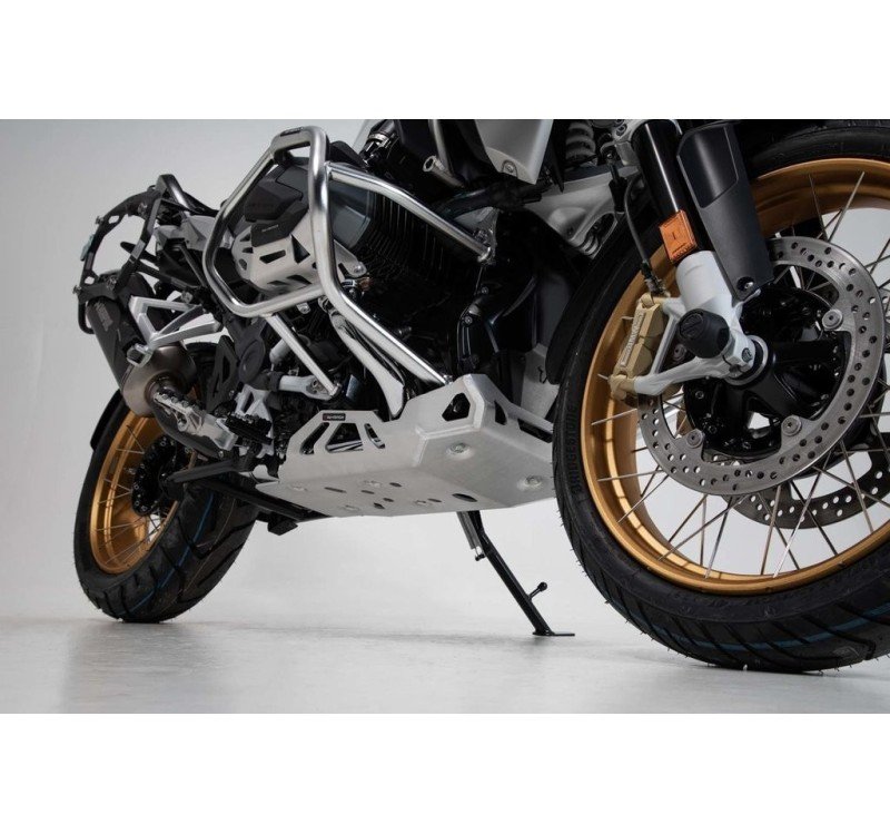 Con sus paredes de grosor cinco milímetros, este protector de motor, especialmente sólido, fabricado en aluminio cepillado, ofrece protección inmejorable a valiosos componentes de los modelos BMW R 1250 GS und R 1250 GS Adventure, tanto dentro como fuera de la carretera. La fuerza se distribuye uniformemente por los resistentes puntos de fijación mediante tres elementos de montaje. Además, estos facilitan significativamente la instalación.