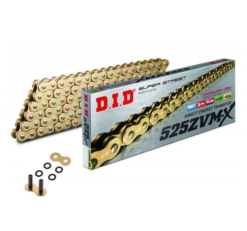 Cadena dorada DID 525 ZVMX2 de 116 eslabones y eslabón para remachar. Resistencia a la tracción 4720 kg