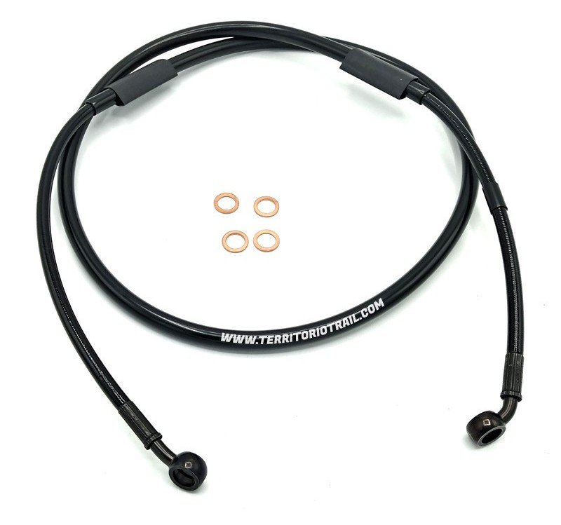 Latiguillos de freno JMP confeccionados con racores de acero y prensados con tuberia de teflón revestida con acero trenzado. De esta manera se elimina la sensación de freno esponjoso, que se tiene a partir de latiguillos convencionales de caucho. El acero inoxidable también ofrece una perfecta protección contra la oxidación.