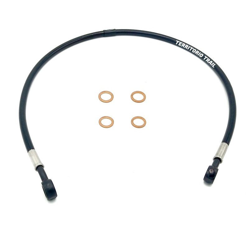 Latiguillos de freno JMP confeccionados con racores de acero y prensados con tuberia de teflón revestida con acero trenzado. De esta manera se elimina la sensación de freno esponjoso, que se tiene a partir de latiguillos convencionales de caucho. El acero inoxidable también ofrece una perfecta protección contra la oxidación.