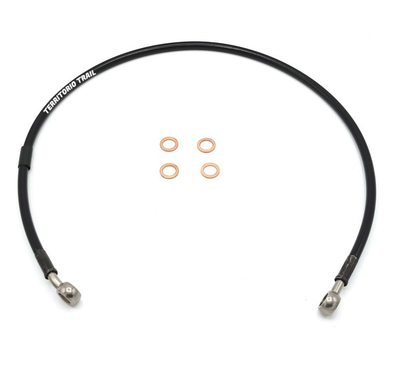 Latiguillos de freno JMP confeccionados con racores de acero y prensados con tuberia de teflón revestida con acero trenzado. De esta manera se elimina la sensación de freno esponjoso, que se tiene a partir de latiguillos convencionales de caucho. El acero inoxidable también ofrece una perfecta protección contra la oxidación.