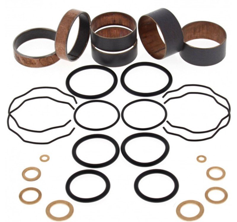 - Contiene las piezas necesarias para reparar / renovar las dos barras de horquilla: circlips, casquillos de deslizamiento, juntas y arandelas