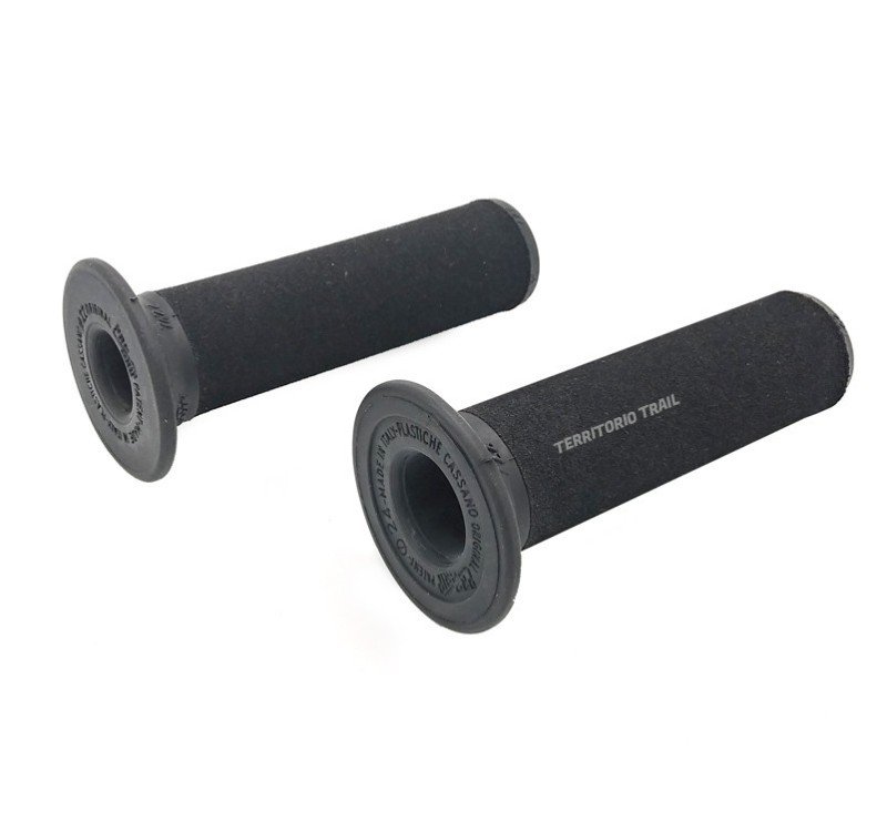 Juego de puños de compuesto bimaterial, con cuerpo de goma y tacto exterior de espuma. Extremo final abierto para poder instalarlos con contrapesos o paramanos