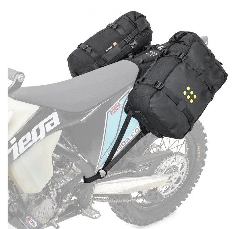 Durante el desarrollo de las alforjas Kriega se prestó especial atención a la resistencia y a la estanqueidad, pues ambas características son fundamentales para cualquier aventura. El sistema de sujección garantizan una buena estabilidad y permiten retirar las bolsas con rapidez. Se adaptan a multitud de modelos de motos trail y enduro, como KTM 450, KTM 500, Husqvarna 450, Husqvarna 501, Gas Gas, entre otros.