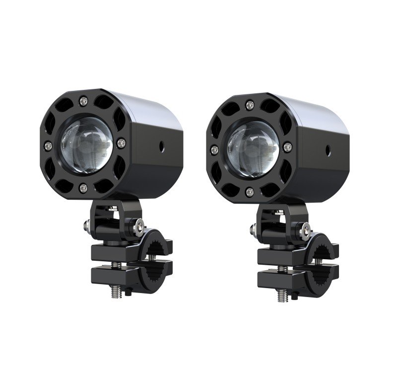 Kit de focos auxiliares de iluminación LED de 25W cada uno. Manejo con el mando de control remoto para instalar en el manillar, sin cables. Diferentes modos de iluminación y luz de emergencia.