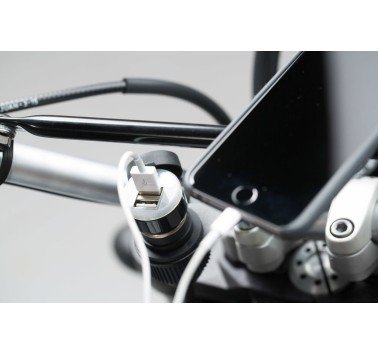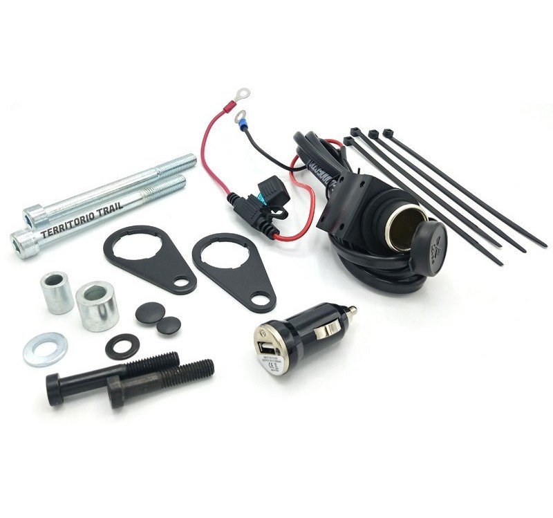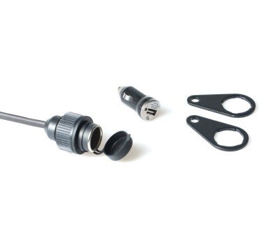 La toma de alimentación tipo mechero incluye portafusible y se puede conectar directamente a la batería ó a la instalación eléctrica de la moto. El adaptador de USB que viene incluido tiene una potencia de salida de hasta 1000 mA / 5V y permite alimentar smartphones y sistemas de navegación.