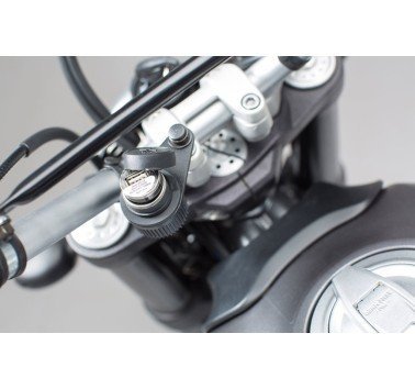 Kit eléctrico con amplio set de montaje para adaptarse a todas la posibilidades. La toma de alimentación puede instalarse directamente al manillar (de cualquier diámetro), sujetarse en los tornillos del manillar (gracias a los tornillos de rosca M8 y M10), base de espejos retrovisores y otras aplicaciones (por ejemplo insertada en plásticos de carenado).