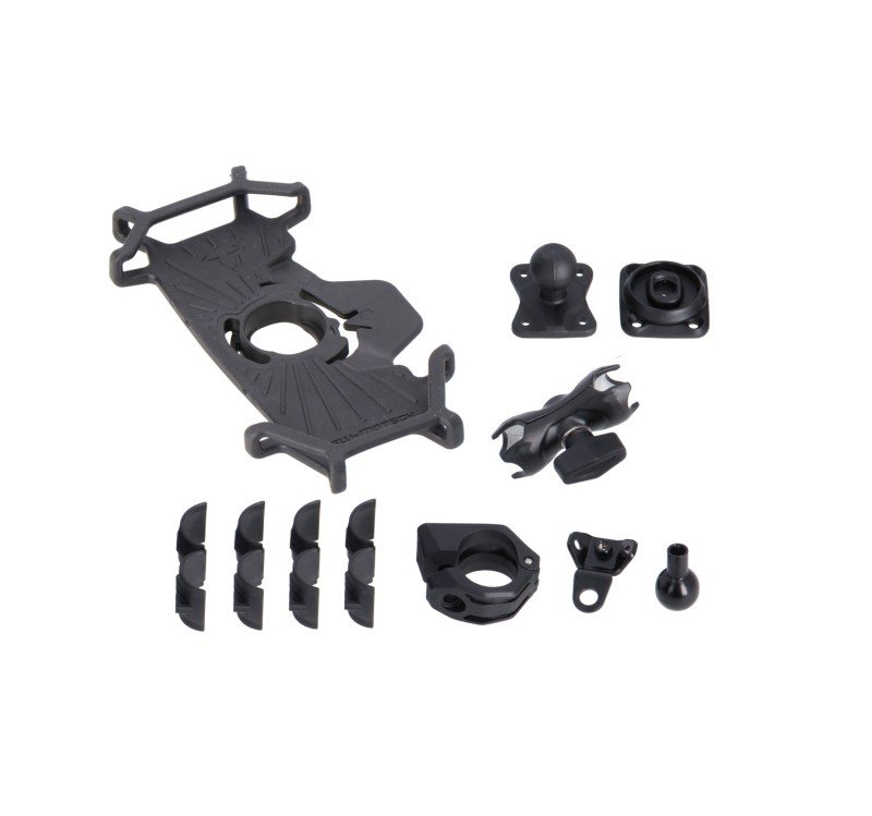O nosso kit universal oferece uma grande variedade de opções de fixação para diferentes motocicletas: a bola incluída de uma polegada pode ser fixada tanto a uma rosca M6 como M8, ao suporte de rosca do espelho ou também com um grampo de montagem. A pinça de montagem é projetada para o manipulador, com um diâmetro de 22,28 mm ou 1 polegada. O braço com pedal giratório facilita o posicionamento no painel; deste modo, o condutor tem sempre em vista as indicações de navegação sem perder uma boa visão do painel de comando. O suporte T-Lock incluído no conteúdo da entrega e dotado de recipiente para smartphone permite a fixação rápida de smartphones no kit universal para GPS. O suporte T-Lock pode ser instalado no braço de fixação por um giro de um quarto de volta no sentido horário. As cintas de silicone do recipiente para smartphone permitem fixar dispositivos de diferentes tamanhos.