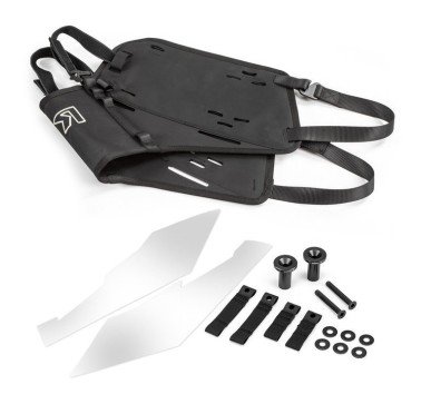 Las correas de longitud fija facilitan el montaje y la forma del cuerpo principal diseñada específicamente proporciona un ajuste firme y seguro con una gran distancia del escape. Se tarda menos de un minuto en montar el sistema en la moto y solo unos segundos en quitarlo.