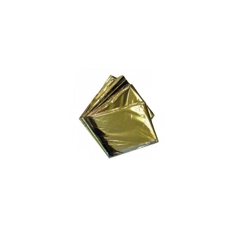 Mánta térmica de aluminio contra la hipotermia y también como escudo térmico. Cabe en cualquier bolsa de herramientas, kit de equipaje, primeros auxilios...