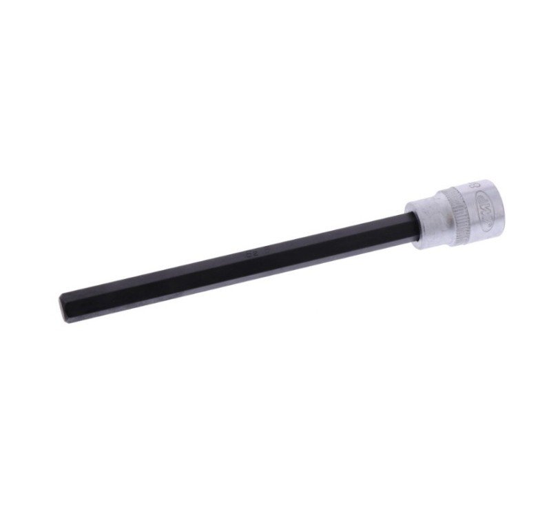 Este dado de llave Allen extra largo de 8 mm con cuadrado de 3/8" es ideal para quitar y volver a colocar la varilla del amortiguador en las horquillas delanteras. La longitud adicional es necesaria para alcanzar el tornillo más allá del orificio del eje. ¡La herramienta es perfecta para un trabajo sin daños!