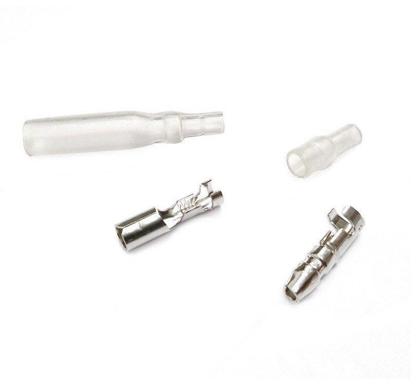 Este práctico juego de terminales fabricados en Japón contiene los conectores de estilo "bala" que llevan las motos japonesas en numerosas conexiones de intermitentes, pilotos traseros, faros, etc.