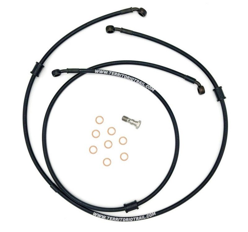 Desde la bomba de freno saldrán los dos latiguillos, uno directo a la pinza de freno izquierda y otro a la pinza derecha, para ello se utiliza un nuevo tornillo banjo de doble salida. De este modo se elimina el reenvío original, sin reducciones de caudal. Los ternimales de los nuevos latiguillos son giratorios, lo que facilita su instalación y evita que puedan quedar retorcidos.